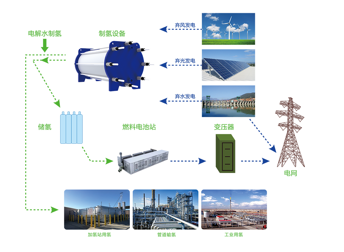 隨著國內(nèi)以風(fēng)電、太陽能為主的可再生能源快速增長,可再生能源消納能力不足和并網(wǎng)困難等問題愈發(fā)突出,在嚴(yán)峻的環(huán)保問題下,提高可再生能源的裝機(jī)比例是實(shí)現(xiàn)可持續(xù)發(fā)展的必然選擇。然而與傳統(tǒng)電網(wǎng)電力相比,可再生能源具有不穩(wěn)定性,導(dǎo)致供應(yīng)與需求失衡,針對這一行業(yè)難點(diǎn),安思卓通過技術(shù)研發(fā),創(chuàng)造性提出10MW級棄電解決方案,旨在利用可再生能源發(fā)電的電能來電解水制氫,把多余的太陽能、風(fēng)能、水能轉(zhuǎn)化為氫能,需要時再將氫能轉(zhuǎn)換回電能,并且可作為高價值的化工原料支持多種工業(yè)應(yīng)用。